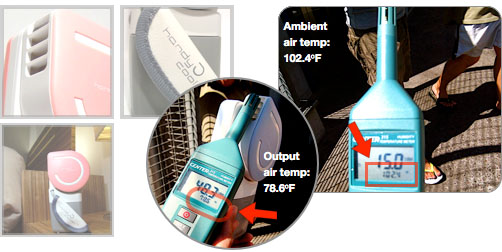Here are 2 images of the R&D team conducting a field test in the streets of Las Vegas in summer 2008. The temperature on the day was 102.4ºF, with a humidity of 15%. The result: the temperature of the air was cooled by 23.8ºF!